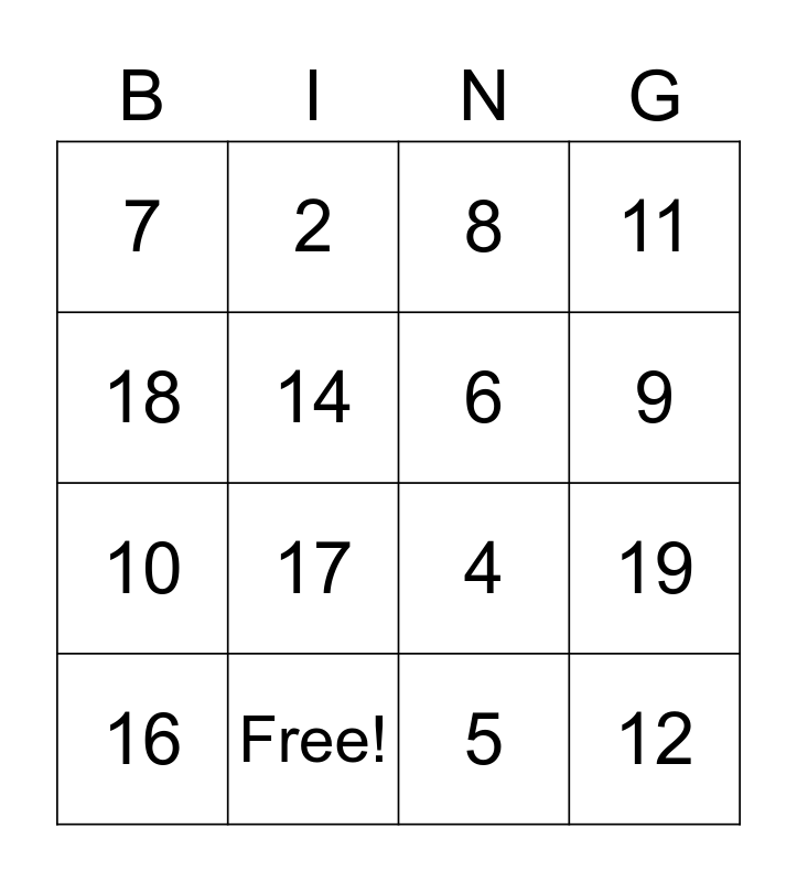 This bingo card has 21 words: Free!, 1, 2, 3, 5, 6, 7, 8, 4, 9, 10, 11, 12, 13, 14, 15, 16, 17, 18, 19 and 20.