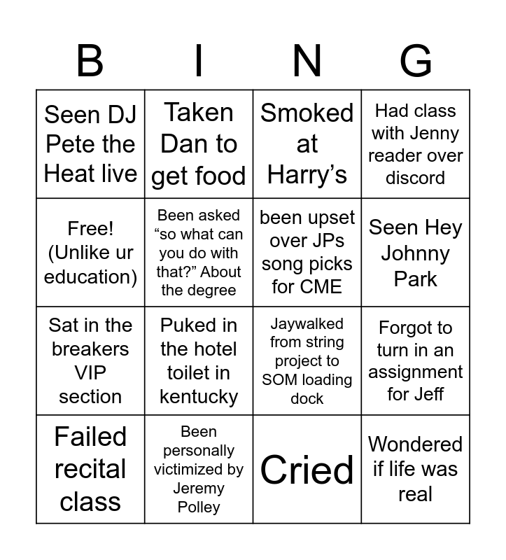 This bingo card has 16 words: Been personally victimized by Jeremy Polley, Forgot to turn in an assignment for Jeff, Smoked at Harry’s, Seen DJ Pete the Heat live, Sat in the breakers VIP section, Taken Dan to get food, Jaywalked from string project to SOM loading dock, Cried, Free! (Unlike ur education), Been asked “so what can you do with that?” About the degree, Failed recital class, Had class with Jenny reader over discord, Puked in the hotel toilet in kentucky, Seen Hey Johnny Park, been upset over JPs song picks for CME and Wondered if life was real.