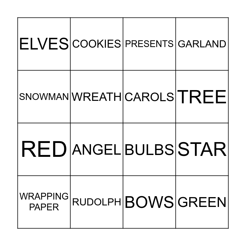 This bingo card has a free space and 24 words: SANTA, STOCKING, TREE, LIGHTS, SNOWMAN, ELVES, WREATH, COOKIES, RUDOLPH, SNOW, RED, GREEN, NOEL, SLEIGH, CAROLS, BELL, BOWS, PRESENTS, ANGEL, STAR, WRAPPING PAPER, BABY JESUS, GARLAND and REJOICE.