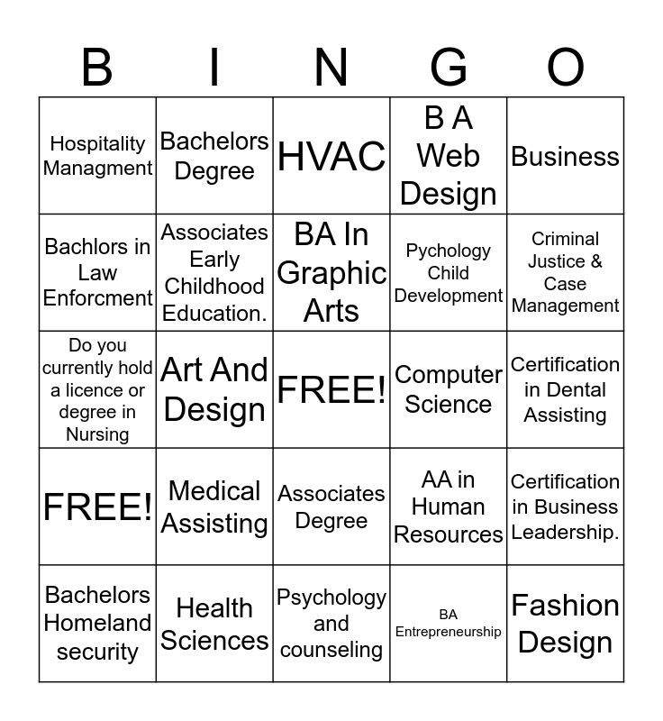 This bingo card has a free space and 24 words: Medical Assisting, Health Sciences, BA In Graphic Arts, Bachelors Homeland security, Business, Hospitality Managment, Bachlors in Law Enforcment, Bachelors Degree, Computer Science, Associates Degree, Pychology Child Development, Do you currently hold a licence or degree in Nursing, AA in Human Resources, Certification in Business Leadership., Associates Early Childhood Education., BA Entrepreneurship, Certification in Dental Assisting, HVAC, Criminal Justice & Case Management, Art And Design, Fashion Design, FREE!, B A Web Design and Psychology and counseling.