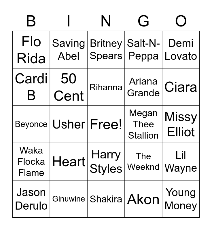 This bingo card has a free space and 24 words: Heart, Ginuwine, Rihanna, Jason Derulo, Demi Lovato, Flo Rida, Cardi B, Saving Abel, Megan Thee Stallion, Harry Styles, Ariana Grande, Beyonce, The Weeknd, Lil Wayne, 50 Cent, Akon, Missy Elliot, Britney Spears, Ciara, Usher, Young Money, Waka Flocka Flame, Salt-N-Peppa and Shakira.