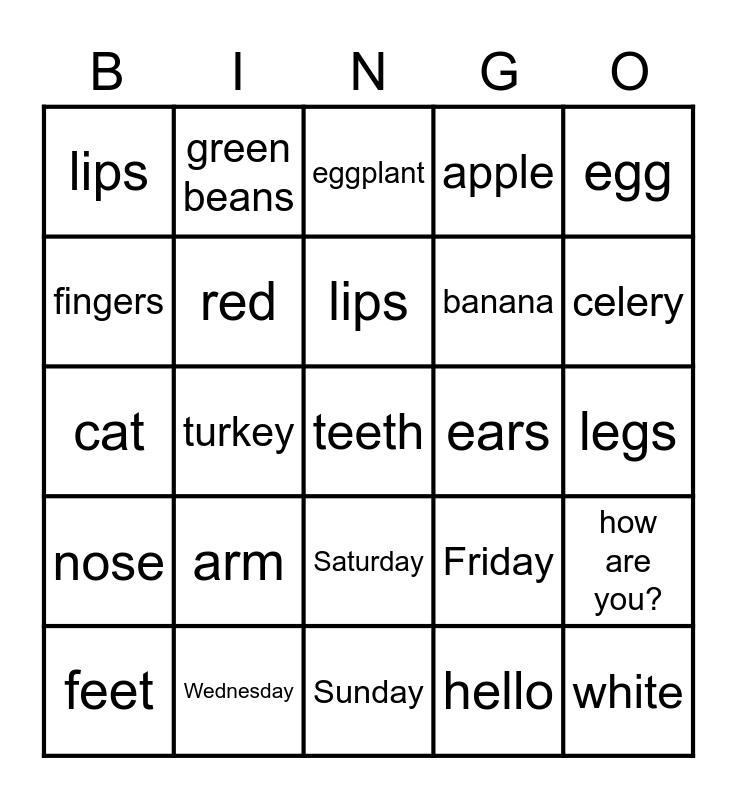 This bingo card has 60 words: watermelon, Wednesday, carrot, nose, hello, March, red, july, banana, arm, apple, thursday, fingers, blue, body, lips, teeth, egg, thank you, lips, ears, eggplant, feet, how are you?, purple, head, black, blue, celery, eyes, Tuesday, nose, tongue, honey, green beans, stuffing, banana, turkey, dog, cat, onions, arm, legs, feet, Friday, Monday, Help me., Please, Thank you., Saturday, Sunday, lettuce, June, grapes, water, yellow, orange, green, white and pink.