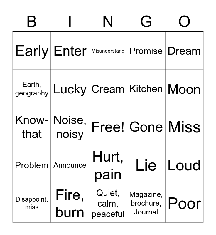 This bingo card has a free space and 24 words: Announce, Fire, burn, Cream, Disappoint, miss, Dream, Early, Earth, geography, Enter, Gone, Hurt, pain, Kitchen, Know-that, Lie, Loud, Lucky, Magazine, brochure, Journal, Miss, Misunderstand, Moon, Noise, noisy, Poor, Problem, Promise and Quiet, calm, peaceful.