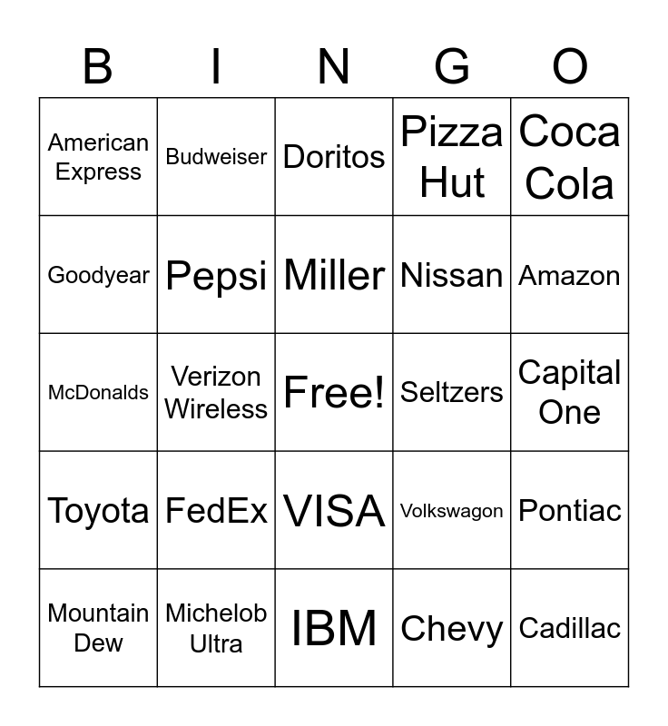This bingo card has a free space and 34 words: Ford, Chevy, Dodge, Honda, Toyota, Pepsi, Coca Cola, Mountain Dew, Budweiser, Coors, Miller, Doritos, Allstate, State Farm, Seltzers, Amazon, Michelob Ultra, McDonalds, FedEx, Volkswagon, VISA, Mastercard, American Express, Capital One, IBM, Cadillac, Pizza Hut, Jeep, Nissan, Goodyear, AT&T, Verizon Wireless, Pontiac and United Way.