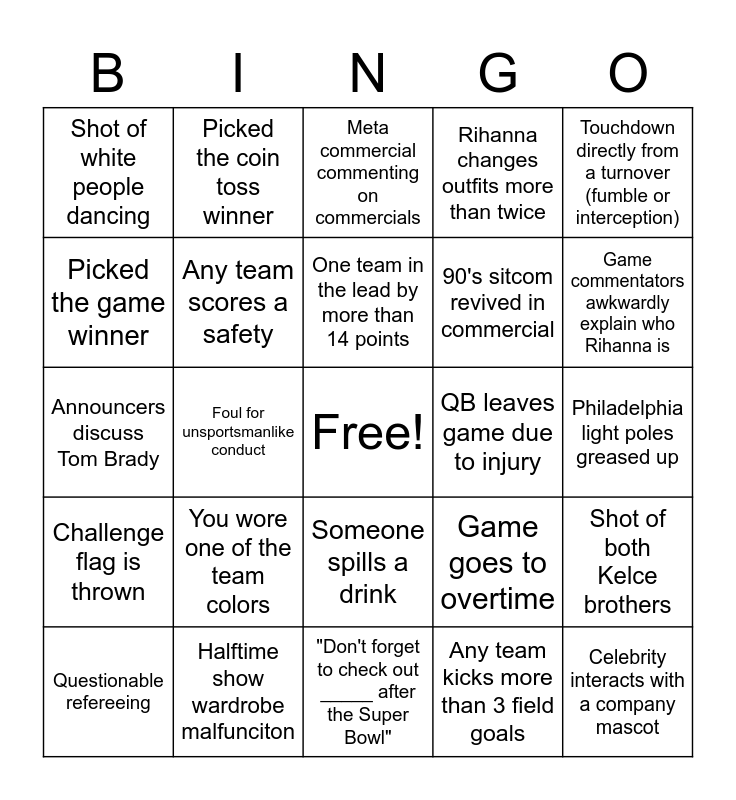 This bingo card has a free space and 24 words: You wore one of the team colors, Halftime show wardrobe malfunciton, One team in the lead by more than 14 points, Questionable refereeing, Touchdown directly from a turnover (fumble or interception), Shot of white people dancing, Picked the game winner, Picked the coin toss winner, QB leaves game due to injury, Someone spills a drink, 90's sitcom revived in commercial, Announcers discuss Tom Brady, Game goes to overtime, Shot of both Kelce brothers, Any team scores a safety, Any team kicks more than 3 field goals, Philadelphia light poles greased up, Meta commercial commenting on commercials, Game commentators awkwardly explain who Rihanna is, Foul for unsportsmanlike conduct, Celebrity interacts with a company mascot, Challenge flag is thrown, Rihanna changes outfits more than twice and "Don't forget to check out _____ after the Super Bowl".