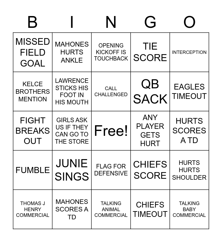 This bingo card has a free space and 29 words: THOMAS J HENRY COMMERCIAL, POP CORNERS COMMERCIAL, GIRLS ASK US IF THEY CAN GO TO THE STORE, WILLIE BURPS, MISSED FIELD GOAL, OPENING KICKOFF IS TOUCHBACK, LAWRENCE STICKS HIS FOOT IN HIS MOUTH, JUNIE SINGS, ANY PLAYER GETS HURT, MAHONES SCORES A TD, HURTS SCORES A TD, TALKING BABY COMMERCIAL, TALKING ANIMAL COMMERCIAL, CHIEFS TIMEOUT, EAGLES TIMEOUT, FLAG FOR OFFENSIVE HOLDING, FLAG FOR DEFENSIVE, FUMBLE, INTERCEPTION, FIGHT BREAKS OUT, CHIEFS SCORE, EAGLES SCORE, QB SACK, KELCE BROTHERS MENTION, TIE SCORE, MAHONES HURTS ANKLE, HURTS HURTS SHOULDER, CALL CHALLENGED and CELEBRITY SIGHTING IN CROWD.