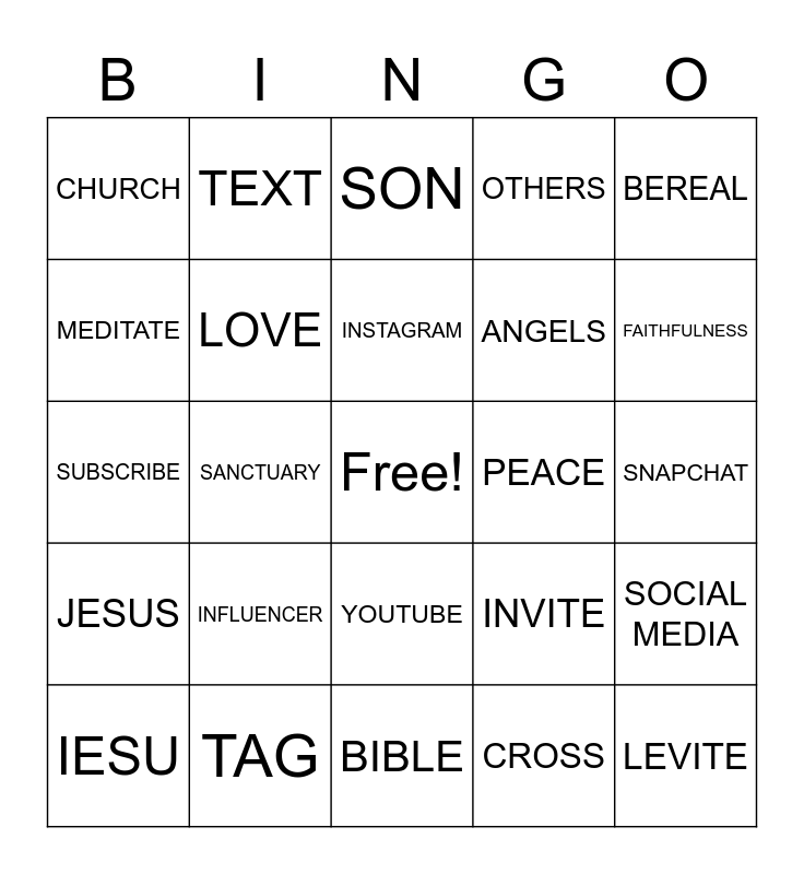This bingo card has a free space and 65 words: OFFLINE, ONLINE, PHONE, SOCIAL MEDIA, EMOJI, EMAIL, TEXT, MESSAGE, INSTAGRAM, FACEBOOK, YOUTUBE, TIKTOK, SNAPCHAT, BEREAL, QUIET TIME, MEDITATE, SANCTUARY, CHURCH, FAMILY, ANGELS, INFLUENCER, JESUS, OTHERS, NEIGHBOR, UNPLUG, SERVE, SAMARITAN, BANDIT, LEVITE, SELFIE, IESU, FOLLOWER, LIKES, SHARE, INVITE, TAG, COMMENT, SUBSCRIBE, CROSS, FORGIVE, LOVE, JOY, PEACE, PATIENCE, KINDNESS, GOODNESS, FAITHFULNESS, GENTLENESS, SELF-CONTROL, SUNDAY SCHOOL, COMMIT, SAVIOR, MATTHEW, BIBLE, PRAYER, HOLY SPIRIT, FATHER, SON, TEACHER, STUDENT, SHEEP, GOAT, HEAVEN, ETERNITY and OFFERING.