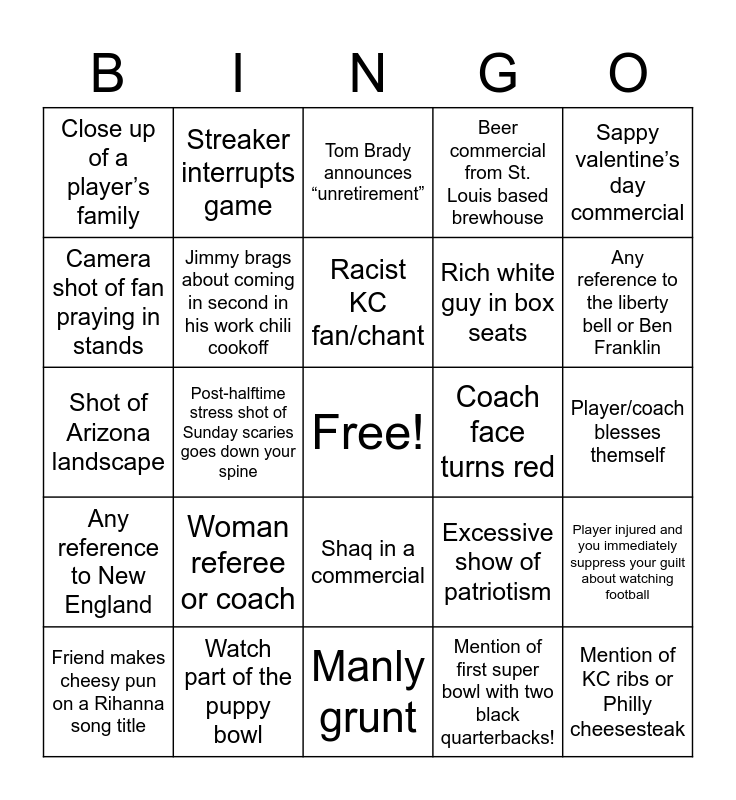 This bingo card has a free space and 26 words: Shaq in a commercial, Mention of first super bowl with two black quarterbacks!, Racist KC fan/chant, Watch part of the puppy bowl, Sappy valentine’s day commercial, Close up of a player’s family, Camera shot of fan praying in stands, Streaker interrupts game, Player/coach blesses themself, Excessive show of patriotism, Rich white guy in box seats, Shot of Arizona landscape, Player injured and you immediately suppress your guilt about watching football, Friend makes cheesy pun on a Rihanna song title, Post-halftime stress shot of Sunday scaries goes down your spine, Lukewarm NFL message about social justice, Beer commercial from St. Louis based brewhouse, Any reference to New England, Tom Brady announces “unretirement”, Mention of KC ribs or Philly cheesesteak, Any reference to the liberty bell or Ben Franklin, Manly grunt, Coach face turns red, Woman referee or coach, Jimmy brags about coming in second in his work chili cookoff and Footage of Rihanna’s baby.