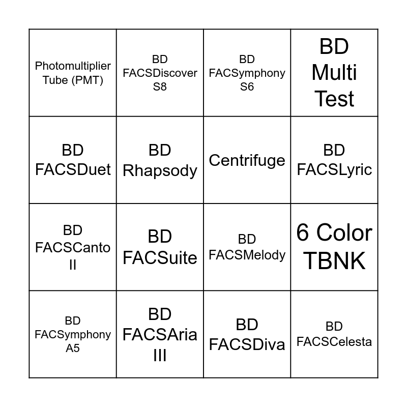 This bingo card has 16 words: BD FACSAria III, 6 Color TBNK, BD FACSymphony S6, Photomultiplier Tube (PMT), BD FACSCanto II, BD FACSDiscover S8, BD FACSMelody, BD FACSDiva, BD FACSDuet, BD Rhapsody, BD FACSymphony A5, BD Multi Test, BD FACSuite, BD FACSLyric, Centrifuge and BD FACSCelesta.