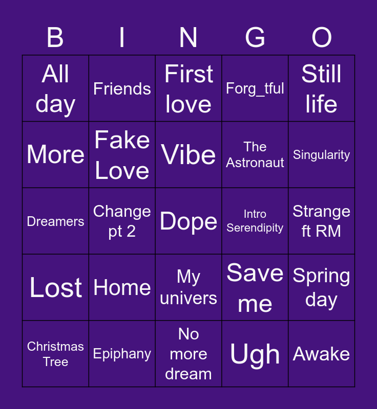 This bingo card has a free space and 24 words: Home, Epiphany, Vibe, Christmas Tree, Still life, All day, More, Friends, Intro Serendipity, My univers, The Astronaut, Dreamers, Save me, Spring day, Fake Love, Ugh, Strange ft RM, First love, Singularity, Change pt 2, Awake, Lost, Forg_tful and No more dream.