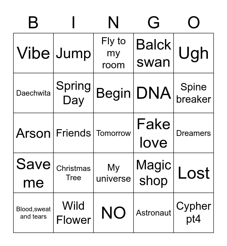 This bingo card has a free space and 24 words: Christmas Tree, Wild Flower, Begin, Blood,sweat and tears, Ugh, Vibe, Daechwita, Jump, Fake love, My universe, DNA, Arson, Magic shop, Lost, Spring Day, Astronaut, Dreamers, Fly to my room, Spine breaker, Friends, Cypher pt4, Save me, Balck swan and NO.