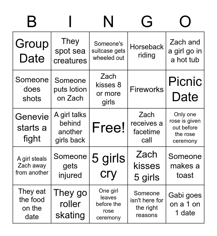 This bingo card has a free space and 24 words: Someone gets injured, They go roller skating, Zach kisses 8 or more girls, They eat the food on the date, Zach and a girl go in a hot tub, Group Date, Someone does shots, They spot sea creatures, Zach receives a facetime call, 5 girls cry, Fireworks, Genevie starts a fight, Zach kisses 5 girls, Someone makes a toast, Someone puts lotion on Zach, Someone isn't here for the right reasons, Only one rose is given out before the rose ceremony, Someone's suitcase gets wheeled out, Picnic Date, A girl talks behind another girls back, Gabi goes on a 1 on 1 date, A girl steals Zach away from another, Horseback riding and One girl leaves before the rose ceremony.