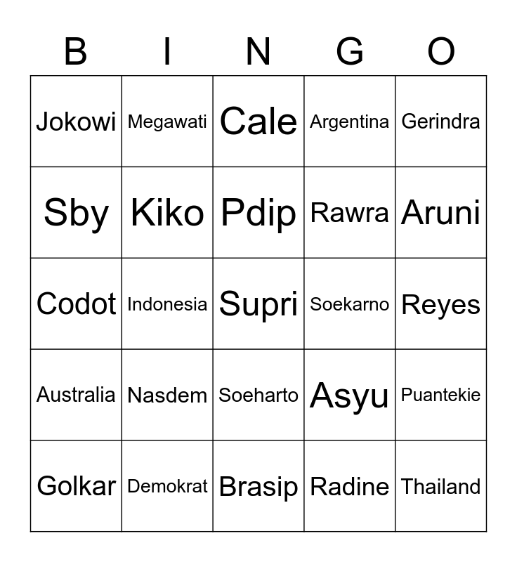 This bingo card has a free space and 24 words: Nasdem, Demokrat, Pdip, Golkar, Gerindra, Jokowi, Sby, Megawati, Soekarno, Soeharto, Rawra, Codot, Asyu, Puantekie, Kiko, Radine, Reyes, Cale, Aruni, Indonesia, Thailand, Australia, Argentina and Brasip.