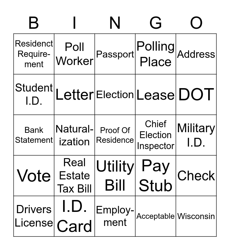 This bingo card has a free space and 24 words: Real Estate Tax Bill, I.D. Card, Election, Drivers License, Address, Residenct Require-ment, Student I.D., Poll Worker, Chief Election Inspector, Utility Bill, Lease, Bank Statement, Pay Stub, Check, Letter, Acceptable, Military I.D., Passport, DOT, Natural-ization, Wisconsin, Vote, Polling Place and Employ-ment.