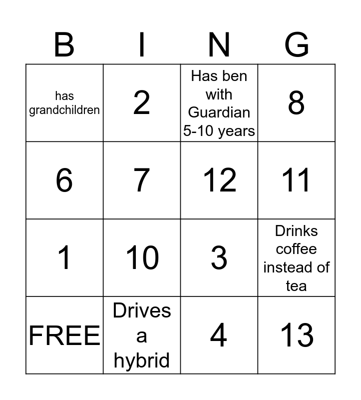 This bingo card has 16 words: Drives a hybrid, Drinks coffee instead of tea, Has ben with Guardian 5-10 years, has grandchildren, 1, 2, 3, 4, 6, 7, FREE, 8, 10, 11, 12 and 13.