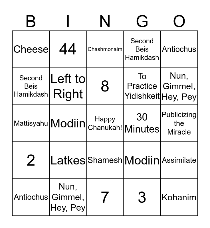 ⚠ This card has duplicate items: Chanukah (2), Mattisyahu (2), 3 (2), Left to Right (2), Nun, Gimmel, Hey, Pey (2), Shamesh (2), 8 (2), 44 (2), Antiochus (2), 2 (2), Modiin (2), Second Beis Hamikdash (2), Kohanim (2), Publicizing the Miracle (2), 30 Minutes (2), Latkes (2), Sacrificing the Pig (2)