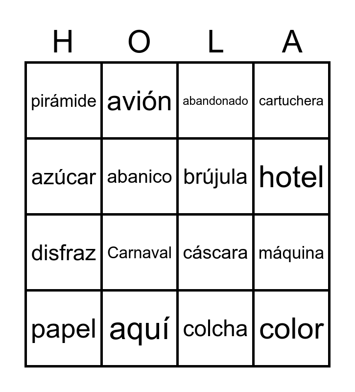 This bingo card has 24 words: médico, ocupar, hotel, colmillo, azúcar, pirámide, abanico, avión, aquí, árbol, disfraz, cáscara, fútbol, América, brújula, mental, colcha, abandonado, Carnaval, máquina, papel, color, cartuchera and lápiz.