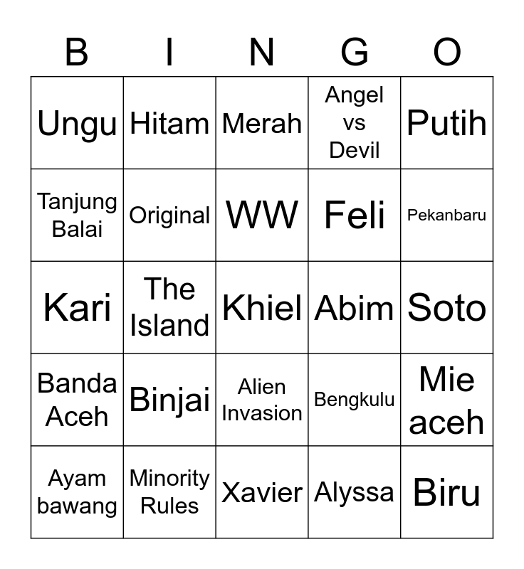This bingo card has a free space and 24 words: Binjai, Minority Rules, WW, Ayam bawang, Putih, Ungu, Tanjung Balai, Hitam, Abim, Alien Invasion, Feli, Kari, Bengkulu, Mie aceh, Original, Alyssa, Soto, Merah, Pekanbaru, The Island, Biru, Banda Aceh, Angel vs Devil and Xavier.