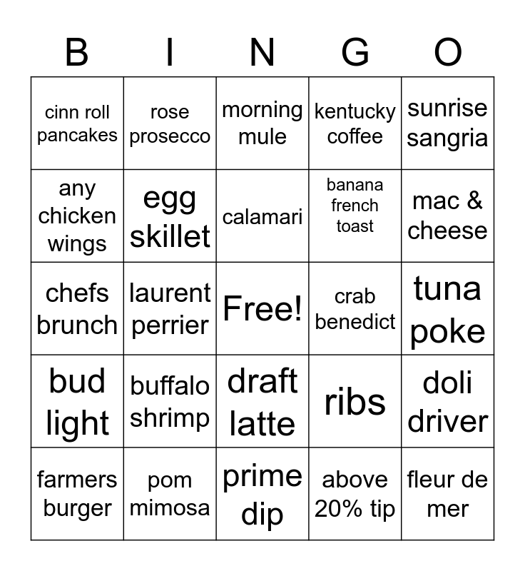 This bingo card has a free space and 24 words: buffalo shrimp, pom mimosa, calamari, farmers burger, sunrise sangria, cinn roll pancakes, any chicken wings, rose prosecco, crab benedict, draft latte, banana french toast, chefs brunch, ribs, doli driver, egg skillet, above 20% tip, tuna poke, morning mule, mac & cheese, laurent perrier, fleur de mer, bud light, kentucky coffee and prime dip.