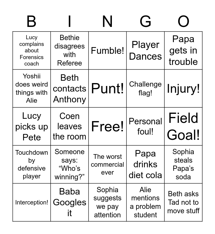 This bingo card has a free space and 25 words: Someone says: “Who’s winning?”, Sophia suggests we pay attention, Punt!, Interception!, Papa gets in trouble, Lucy complains about Forensics coach, Yoshii does weird things with Alie, Bethie disagrees with Referee, Personal foul!, The worst commercial ever, Challenge flag!, Lucy picks up Pete, Papa drinks diet cola, Sophia steals Papa’s soda, Beth contacts Anthony, Touchdown!, Field Goal!, Fumble!, Injury!, Coen leaves the room, Beth asks Tad not to move stuff, Baba Googles it, Touchdown by defensive player, Player Dances and Alie mentions a problem student.