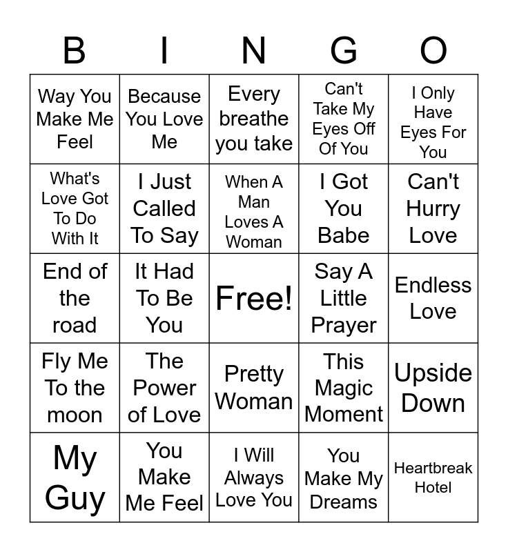 This bingo card has a free space and 48 words: Love Potion #9, Heartbreak Hotel, At Last, I Will Always Love You, The Power of Love, I Want To Know What Love IS, Because You Love Me, Can't Help Falling In Love, What's Love Got To Do With It, My Heart Will Go On, I Just Called To Say, Can't Take My Eyes Off Of You, Upside Down, This Magic Moment, Running Up That Hill, My Girl, When A Man Loves A Woman, Say A Little Prayer, Signed Sealed Delivered, I Only Have Eyes For You, It Had To Be You, You Make My Dreams, Way You Make Me Feel, I Got You Babe, Chapel Of Love, Can't Hurry Love, My Guy, Earth Angel, Pretty Woman, Fly Me To the moon, Some Kinda Wonderful, Ain't No Mountain, Take My Breath Away, Can't Fight This Feeling, You Make Me Feel, On The Wings of love, Just the way you are, Endless Love, All My Life, I've had the time of my life, I just called, Total Eclipse of the heart, Every breathe you take, I have nothing, End of the road, We belong together, I Have nothing and I Will survive.