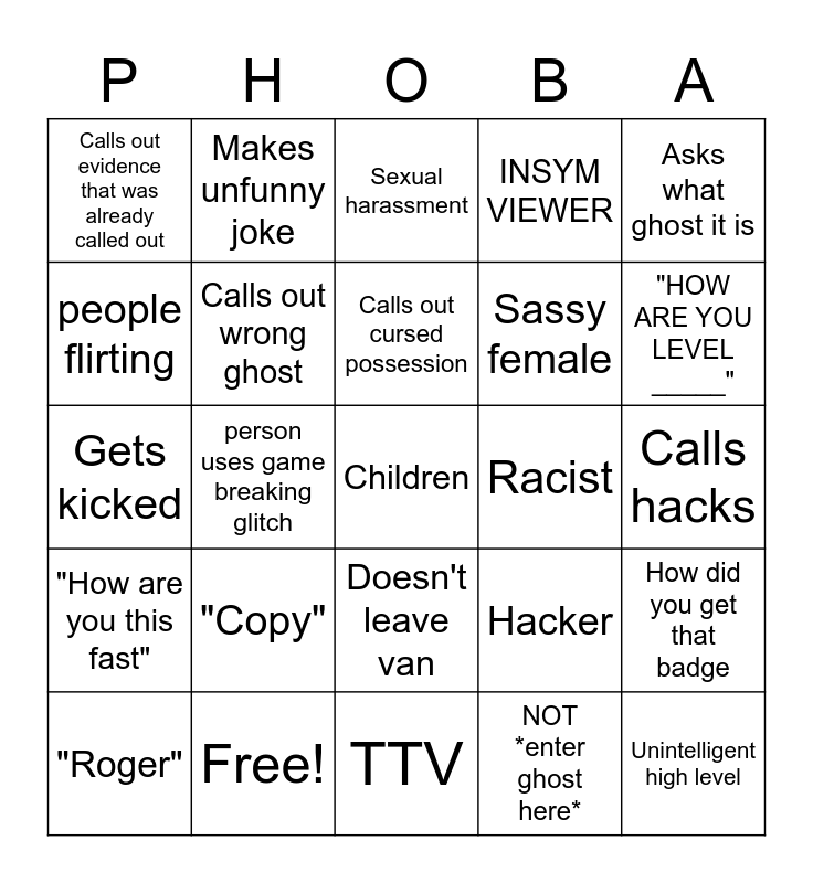 This bingo card has a free space and 24 words: "Roger", "Copy", Calls out cursed possession, NOT *enter ghost here*, Asks what ghost it is, Calls out evidence that was already called out, Makes unfunny joke, Sexual harassment, Racist, Calls hacks, Gets kicked, Calls out wrong ghost, Hacker, How did you get that badge, people flirting, Free!, TTV, INSYM VIEWER, "HOW ARE YOU LEVEL _____", "How are you this fast", person uses game breaking glitch, Doesn't leave van, Sassy female and Unintelligent high level.