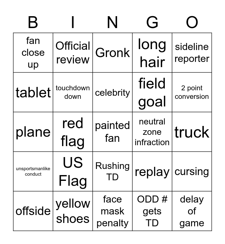 This bingo card has 80 words: Free!, desert scene, Gronk, NFL Logo, dog, cowboy hat, areal view, beard, camera, cell phone, Roman numerals, apple, long hair, fan close up, State Farm logo, tablet, Gatorade logo, US Flag, headphones, truck, cheerleader, sideline reporter, plane, celebrity, touchdown down, one handed catch, fan with sign/flag, onside kick, beer, upset coach, 2 point conversion, holding, face mask penalty, delay of game, offside, neutral zone infraction, Passing TD, PAT, false start, painted fan, betting ad, player pointing, hugging, Clydesdales, Doritos, Official review, coach covering mouth, Nike logo, bringing out chains, tied score (not 0-0), cursing, red flag, replay, yellow flag, fair catch, interception, QB sack, 1st down, time out, Rushing TD, field goal, incomplete pass, fumble, missed kick, complete pass, punt, tattoo, black under eyes, lost helmet, mouth guard, unsportsmanlike conduct, yellow shoes, pass interference, fan close-up, Next Gen Stats ad, EVEN # gets TD, ODD # gets TD, Ref talks with mic off, QB runs and Headphones.