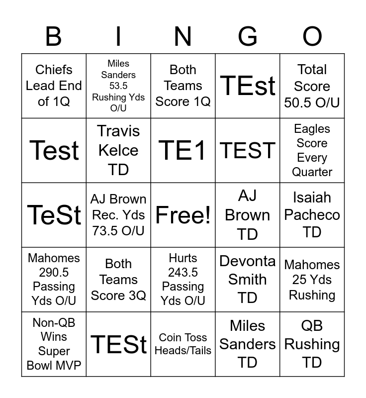 This bingo card has a free space and 31 words: Coin Toss Heads/Tails, Mahomes 1.5 Passing TD O/U, AJ Brown Rec. Yds 73.5 O/U, Chiefs Score Every Quarter, Chiefs Lead End of 1Q, Both Teams Score 1Q, Travis Kelce TD, Devonta Smith TD, AJ Brown TD, Miles Sanders TD, Isaiah Pacheco TD, QB Rushing TD, Score First Chiefs/Eagles, Score Last Chiefs/Eagles, Eagles Score Every Quarter, Hurts 35 Yds Rushing, Mahomes 25 Yds Rushing, Both Teams Score 3Q, Mahomes 290.5 Passing Yds O/U, Hurts 243.5 Passing Yds O/U, Total Score 50.5 O/U, QB Wins Super Bowl MVP, Non-QB Wins Super Bowl MVP, Miles Sanders 53.5 Rushing Yds O/U, TEST, Test, TEst, TeSt, TESt, TE1 and TE2.