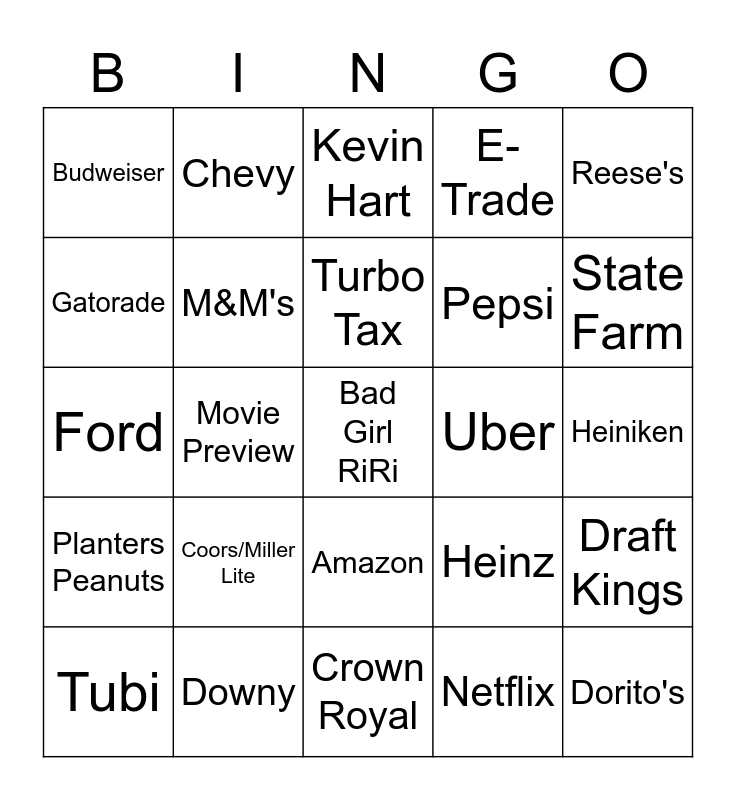 This bingo card has a free space and 24 words: Tubi, Coors/Miller Lite, Turbo Tax, Netflix, Reese's, Budweiser, Chevy, Kevin Hart, Uber, Heiniken, Ford, M&M's, Heinz, Draft Kings, Gatorade, Downy, Crown Royal, E-Trade, State Farm, Planters Peanuts, Movie Preview, Amazon, Pepsi and Dorito's.