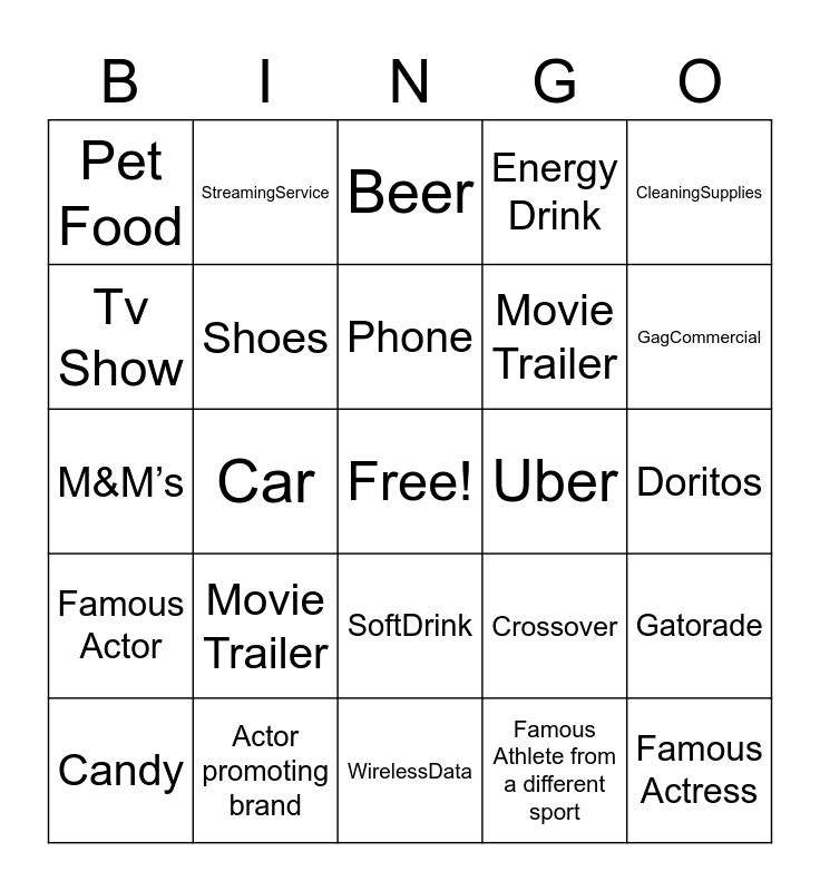 This bingo card has a free space and 25 words: Movie Trailer, WirelessData, Phone, Candy, CleaningSupplies, Pet Food, Tv Show, StreamingService, Uber, SoftDrink, Movie Trailer, M&M’s, Crossover, Gatorade, Shoes, Sweepstakes, Doritos, Beer, GagCommercial, Car, Famous Actress, Actor promoting brand, Famous Actor, Energy Drink and Famous Athlete from a different sport.