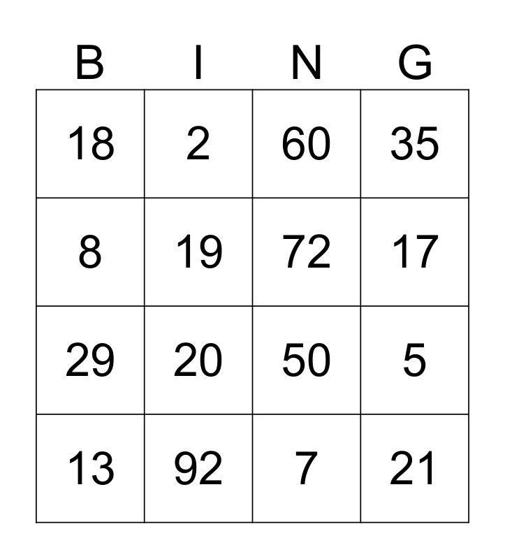 This bingo card has 26 words: 26, 12, 17, 15, 8, 18, 19, 2, 7, 55, 29, 50, 24, 37, 5, 3, 35, 21, 60, 13, 20, 66, 92, 10, 72 and 63.