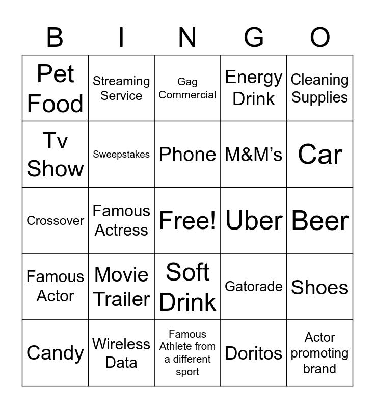 This bingo card has a free space and 24 words: Movie Trailer, Wireless Data, Phone, Candy, Cleaning Supplies, Pet Food, Tv Show, Streaming Service, Uber, Soft Drink, M&M’s, Crossover, Gatorade, Shoes, Sweepstakes, Doritos, Beer, Gag Commercial, Car, Famous Actress, Actor promoting brand, Famous Actor, Energy Drink and Famous Athlete from a different sport.