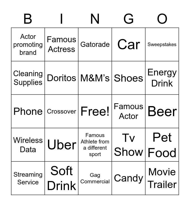 This bingo card has a free space and 24 words: Uber, Soft Drink, M&M’s, Streaming Service, Sweepstakes, Actor promoting brand, Cleaning Supplies, Famous Actress, Famous Actor, Famous Athlete from a different sport, Shoes, Phone, Tv Show, Pet Food, Doritos, Candy, Beer, Gatorade, Energy Drink, Crossover, Movie Trailer, Wireless Data, Car and Gag Commercial.