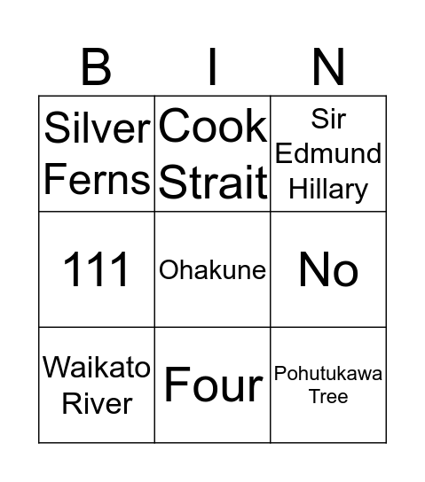 This bingo card has 19 words: Aotearoa, Richie McCaw, Sir Edmund Hillary, Six60, Yes, Ohakune, Taupo, Silver Ferns, Cook Strait, Pohutukawa Tree, Endeavour, No, Waikato River, Auckland, Black Caps, Number 11, 111, Four and 1840.
