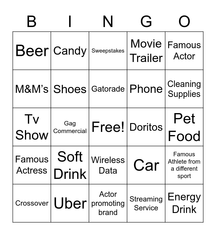 This bingo card has a free space and 24 words: Soft Drink, Uber, Gatorade, Crossover, Famous Actor, Beer, M&M’s, Candy, Doritos, Wireless Data, Phone, Tv Show, Car, Famous Athlete from a different sport, Shoes, Streaming Service, Pet Food, Sweepstakes, Cleaning Supplies, Gag Commercial, Energy Drink, Famous Actress, Movie Trailer and Actor promoting brand.