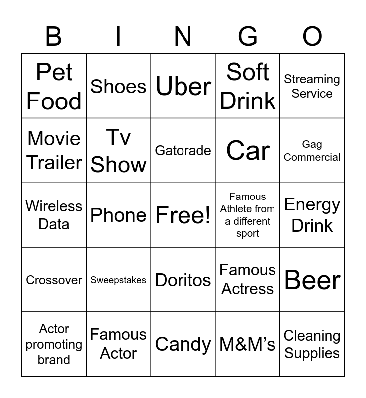 This bingo card has a free space and 24 words: Sweepstakes, Famous Actor, Gatorade, Actor promoting brand, Streaming Service, Pet Food, Movie Trailer, Shoes, Famous Athlete from a different sport, Doritos, Car, Wireless Data, Famous Actress, Beer, Tv Show, M&M’s, Energy Drink, Uber, Gag Commercial, Phone, Cleaning Supplies, Crossover, Soft Drink and Candy.