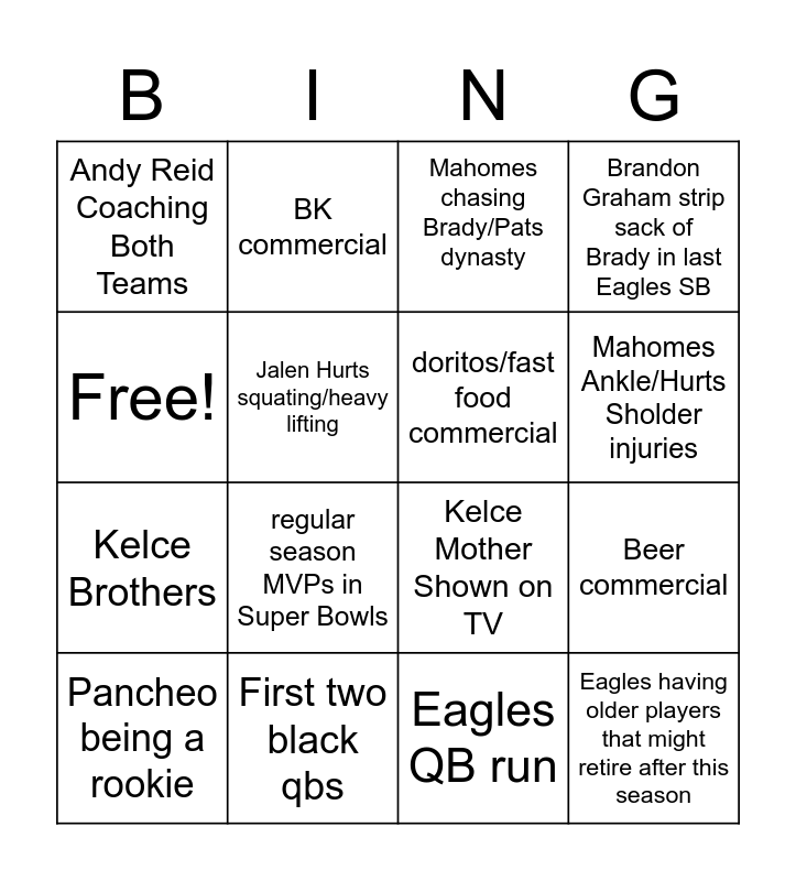 This bingo card has 16 words: First two black qbs, Beer commercial, Mahomes chasing Brady/Pats dynasty, Andy Reid Coaching Both Teams, Kelce Brothers, BK commercial, Kelce Mother Shown on TV, Eagles QB run, Free!, Jalen Hurts squating/heavy lifting, Pancheo being a rookie, Brandon Graham strip sack of Brady in last Eagles SB, regular season MVPs in Super Bowls, Mahomes Ankle/Hurts Sholder injuries, doritos/fast food commercial and Eagles having older players that might retire after this season.