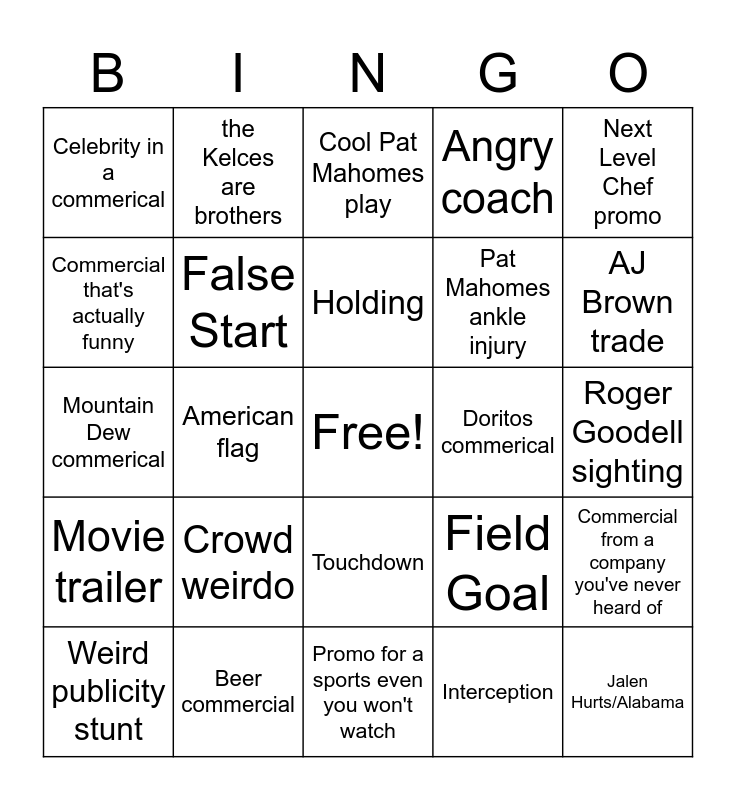 This bingo card has a free space and 26 words: Touchdown, Interception, Holding, Beer commercial, Next Level Chef promo, Celebrity in a commerical, Commercial that's actually funny, the Kelces are brothers, Roger Goodell sighting, Field Goal, Pat Mahomes ankle injury, Mountain Dew commerical, Commercial from a company you've never heard of, Weird publicity stunt, American flag, Call reviewed, Angry coach, Movie trailer, Cool Pat Mahomes play, Jalen Hurts/Alabama, AJ Brown trade, Promo for a sports even you won't watch, Doritos commerical, Crowd weirdo, False Start and 4th down attempt.