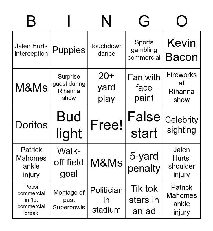 This bingo card has a free space and 69 words: Random Jesus ad, Celebrity sighting, Ant-Man trailer, Field goal longer than 45 yards, Montage of past Superbowls, Tik tok star in an ad, Sports gambling commercial, Puppies, Kevin Bacon, Tom Brady retirement talk, Jalen Hurts’ shoulder injury, Game goes into overtime, Jalen Hurts interception, Touchdown dance, Turbo tax, Bud light, M&Ms, Fan with face paint, Walk-off field goal, Patrick Mahomes ankle injury, False start, 5-yard penalty, Fireworks at Rihanna show, Random Jesus ad, Celebrity sighting, Ant-Man trailer, Field goal longer than 45 yards, Montage of past Superbowls, Tik tok stars in an ad, Sports gambling commercial, Puppies, Kevin bacon, Tom Brady retirement talk, Jalen Hurts’ shoulder injury, Game goes into overtime, Jalen Hurts interception, Touchdown dance, Turbo tax, M&Ms, Fan with face paint, Walk-off field goal, Patrick Mahomes ankle injury, False start, 5-yard penalty, Fireworks at Rihanna show, Pepsi commercial in 1st commercial break, Car sales event, Aston Kutcher, Aaron Rogers in a commercial, Surprise guest during Rihanna show, 20+ yard play, Coke ad, Payment app ad, Politician in stadium, Crypto, Chiefs win, Eagles win, Coach screaming, Fumble, Doritos, Tied game, Receiving touchdown, One-handed catch, Coors, Avocados from Mexico, Downy, Talking animals, Whopper Whopper and Budweiser Kicker misses field goal.