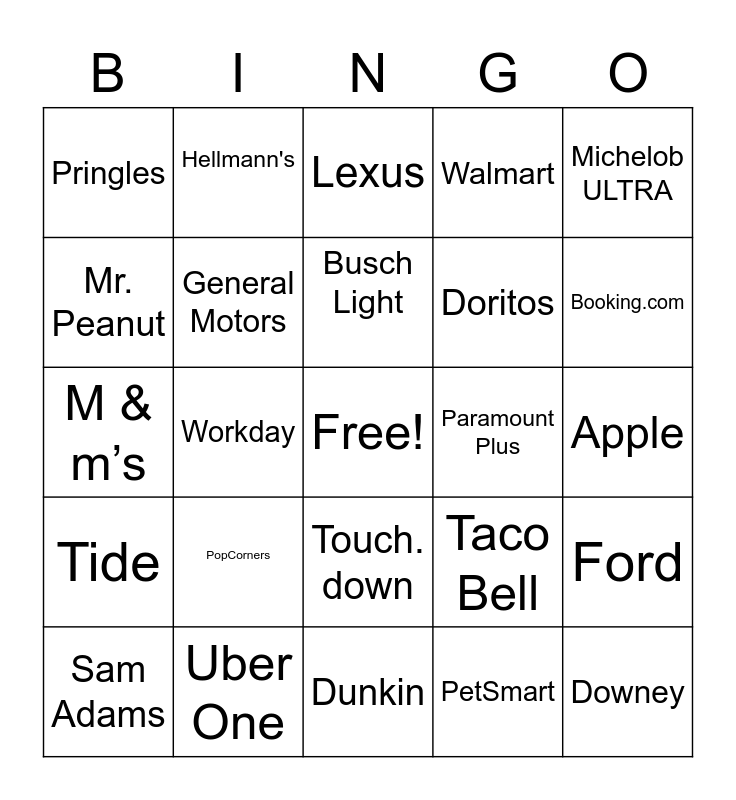This bingo card has a free space and 24 words: PopCorners, Uber One, Busch Light, Sam Adams, Michelob ULTRA, Pringles, Mr. Peanut, Hellmann's, Paramount Plus, Touch. down, Doritos, M & m’s, Taco Bell, Ford, General Motors, PetSmart, Apple, Lexus, Booking.com, Workday, Downey, Tide, Walmart and Dunkin.