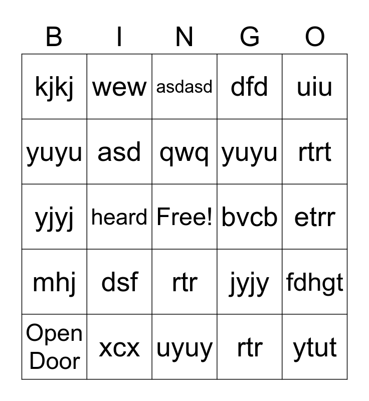 This bingo card has a free space and 29 words: Open Door, test, heard, tete, kjkj, asdasd, asd, dsf, bvcb, xcx, etrr, ytut, uyuy, rtr, rtrt, rtr, rtr, mhj, uiu, yjyj, jyjy, yuyu, yuyu, yuyu, dfd, wew, fdhgt, qwq and dfed.