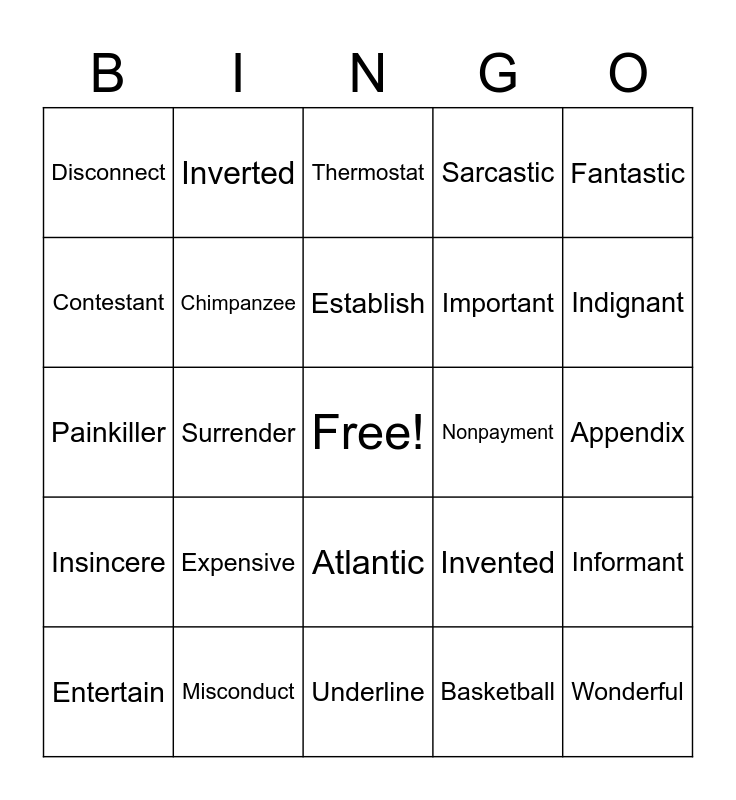 This bingo card has a free space and 26 words: Atlantic, Basketball, Establish, Misconduct, Fantastic, Disconnect, Contestant, Inverted, Appendix, Invented, Important, Painkiller, Informant, Entertain, Surrender, Attentive, Sarcastic, Insincere, Thermostat, Wonderful, Indignant, Underline, Nonpayment, Expensive, Chimpanzee and Turpentine.