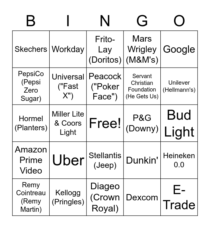 This bingo card has a free space and 44 words: Draft Kings, E-Trade, Rakuten, Remy Cointreau (Remy Martin), Avocados From Mexico, Dexcom, Frito-Lay (Doritos), General Motors, Google, Kellogg (Pringles), Mars Wrigley (M&M's), P&G (Downy), Stellantis (Jeep), Uber, WeatherTech, Diageo (Crown Royal), FanDuel, Hormel (Planters), Kia, Unilever (Hellmann's), Workday, Booking.com, Servant Christian Foundation (He Gets Us), Skechers, Stellantis (Ram), Bud Light, Busch Light, Michelob Ultra, Dunkin', Amazon Prime Video, PopCorners, Heineken 0.0, Intuit (TurboTax), Limit Break, Miller Lite & Coors Light, NFL, Paramount ("Scream VI"), Paramount+, Peacock ("Poker Face"), PepsiCo (Pepsi Zero Sugar), Servant Christian Foundation (He Gets Us), Square Space, Universal ("Fast X") and Warner Bros. Discovery ("The Flash").