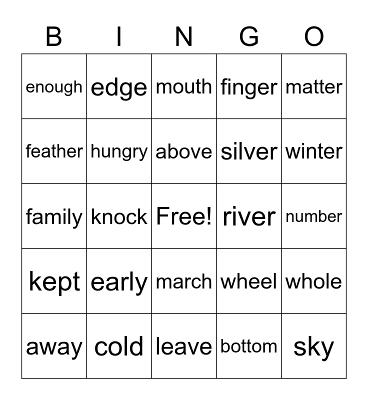 This bingo card has a free space and 24 words: away, early, above, bottom, matter, enough, edge, mouth, river, number, family, hungry, wheel, whole, feather, cold, leave, finger, winter, kept, knock, march, silver and sky.