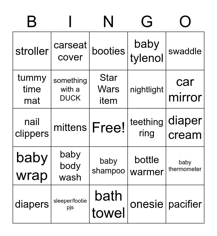 This bingo card has a free space and 44 words: bottle, pacifier, wipes, diapers, socks, onesie, booties, crib sheets, swaddle, sleeper/footie pjs, baby tylenol, teething ring, baby shampoo, baby body wash, baby washcloth, bath towel, baby bathtub, nail clippers, boppy pillow, car mirror, carseat cover, changing table cover, bib, stroller, burp rag, diaper cream, bath toy, bath organizer, bottle warmer, baby wrap, high chair, baby thermometer, blanket, pacifier clip, mittens, diaper bag, gift card, Disney item, Star Wars item, tummy time mat, nightlight, something GREEN, something with a DUCK and stuffed animal.
