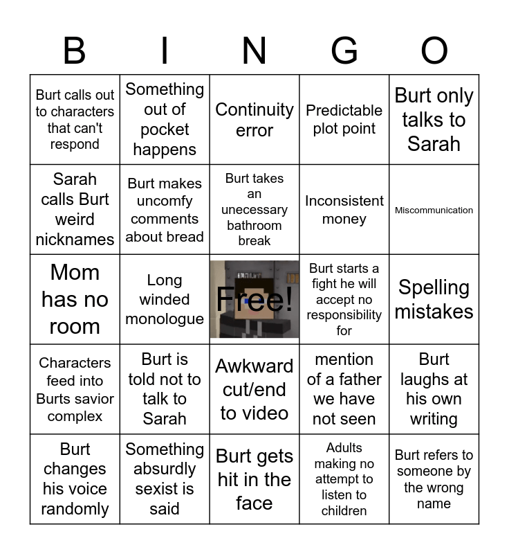 This bingo card has a free space and 24 words: Burt is told not to talk to Sarah, Something absurdly sexist is said, Burt takes an unecessary bathroom break, Burt changes his voice randomly, Burt only talks to Sarah, Burt calls out to characters that can't respond, Sarah calls Burt weird nicknames, Something out of pocket happens, Burt starts a fight he will accept no responsibility for, Awkward cut/end to video, Inconsistent money, Mom has no room, mention of a father we have not seen, Burt laughs at his own writing, Burt makes uncomfy comments about bread, Adults making no attempt to listen to children, Spelling mistakes, Continuity error, Miscommunication, Long winded monologue, Burt refers to someone by the wrong name, Characters feed into Burts savior complex, Predictable plot point and Burt gets hit in the face.