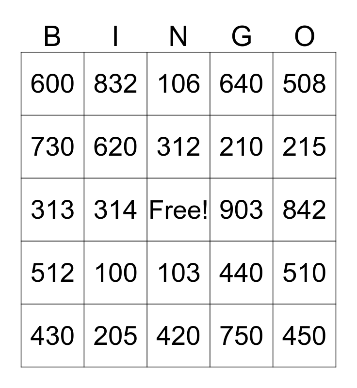 This bingo card has a free space and 24 words: 100, 205, 312, 430, 508, 600, 730, 832, 903, 103, 210, 313, 440, 510, 620, 750, 842, 106, 215, 314, 450, 512, 640 and 420.
