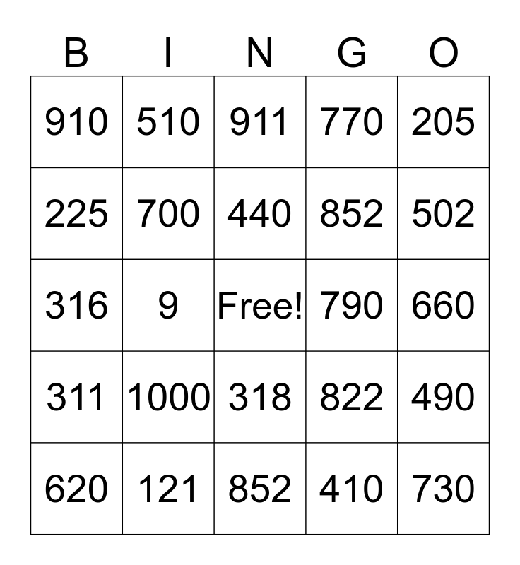 This bingo card has a free space and 24 words: 1000, 121, 440, 620, 205, 910, 225, 510, 790, 318, 852, 316, 822, 490, 700, 410, 660, 911, 502, 9, 730, 311, 770 and 852.