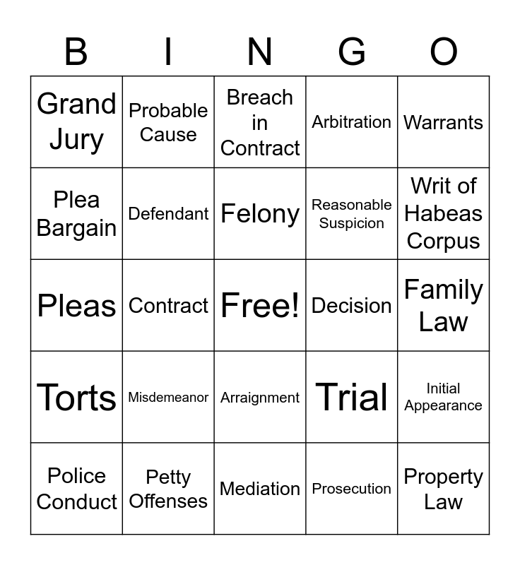 This bingo card has a free space and 24 words: Misdemeanor, Petty Offenses, Felony, Police Conduct, Warrants, Grand Jury, Plea Bargain, Probable Cause, Decision, Arraignment, Reasonable Suspicion, Pleas, Trial, Initial Appearance, Defendant, Prosecution, Family Law, Breach in Contract, Writ of Habeas Corpus, Contract, Property Law, Torts, Arbitration and Mediation.