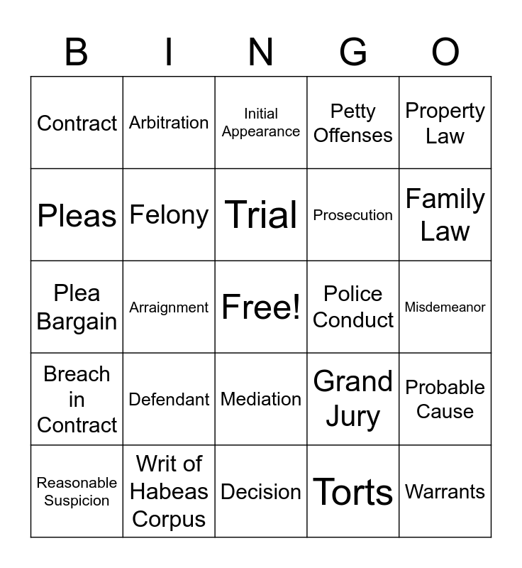 This bingo card has a free space and 24 words: Defendant, Writ of Habeas Corpus, Trial, Reasonable Suspicion, Property Law, Contract, Pleas, Arbitration, Police Conduct, Mediation, Prosecution, Plea Bargain, Grand Jury, Probable Cause, Felony, Torts, Misdemeanor, Initial Appearance, Family Law, Arraignment, Warrants, Breach in Contract, Petty Offenses and Decision.
